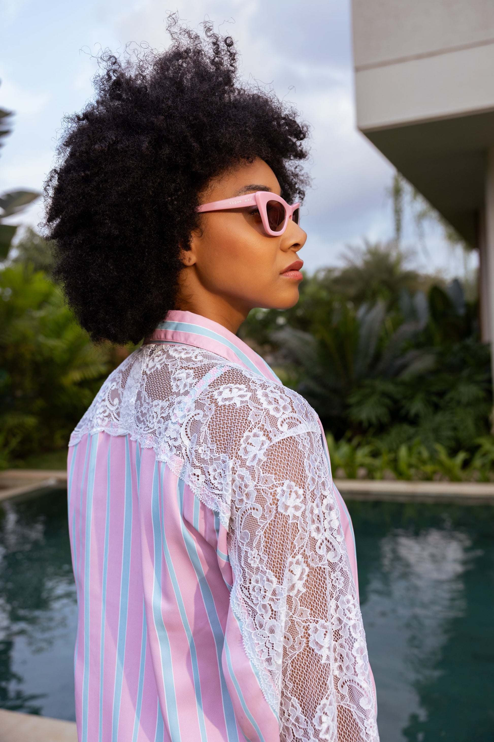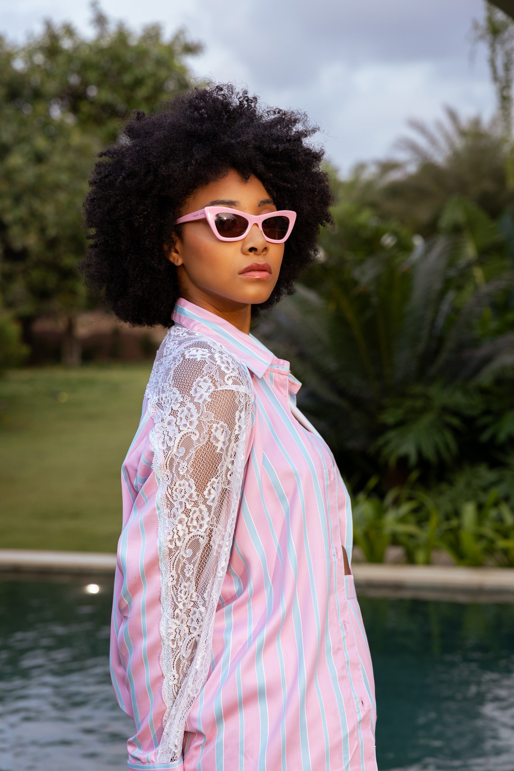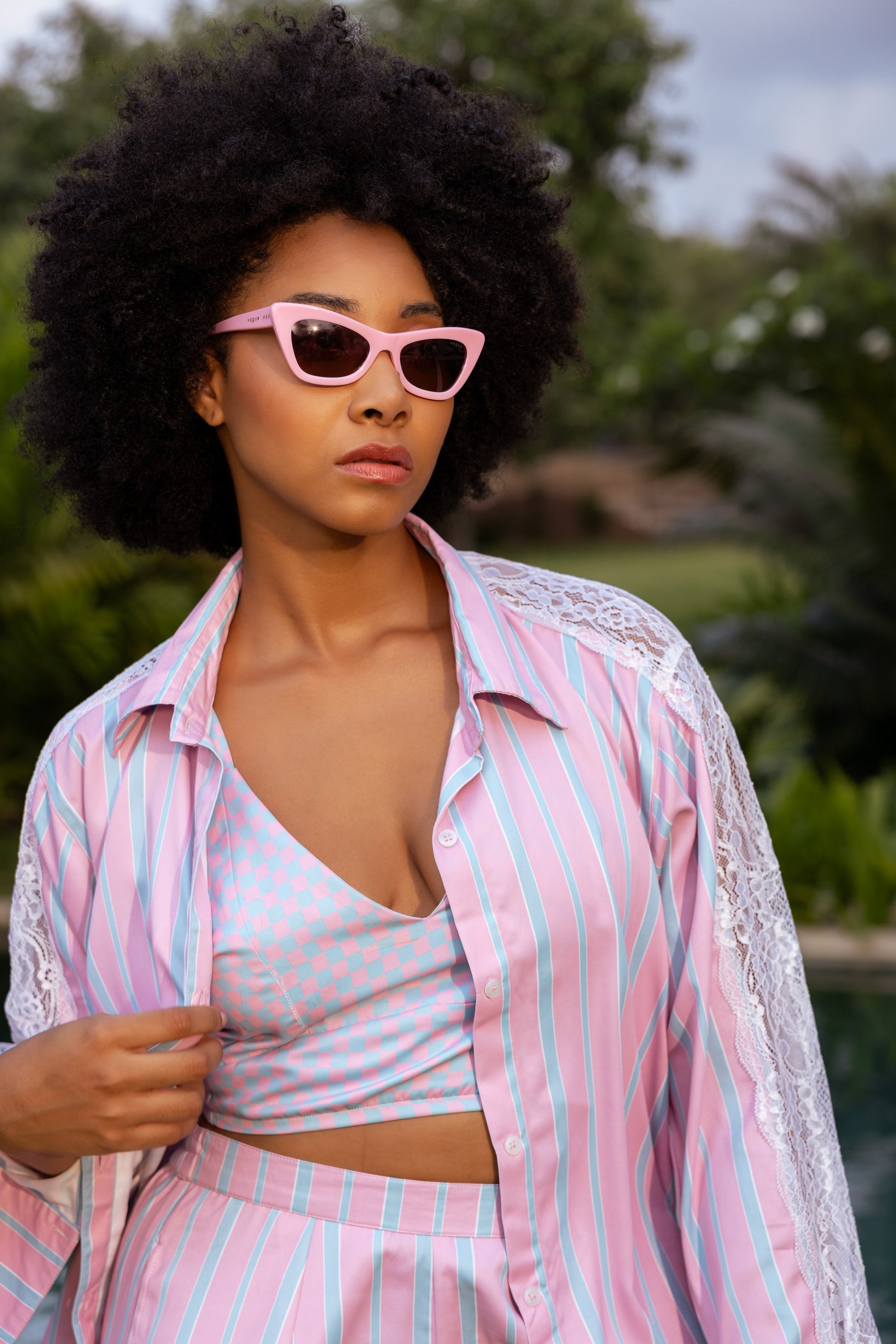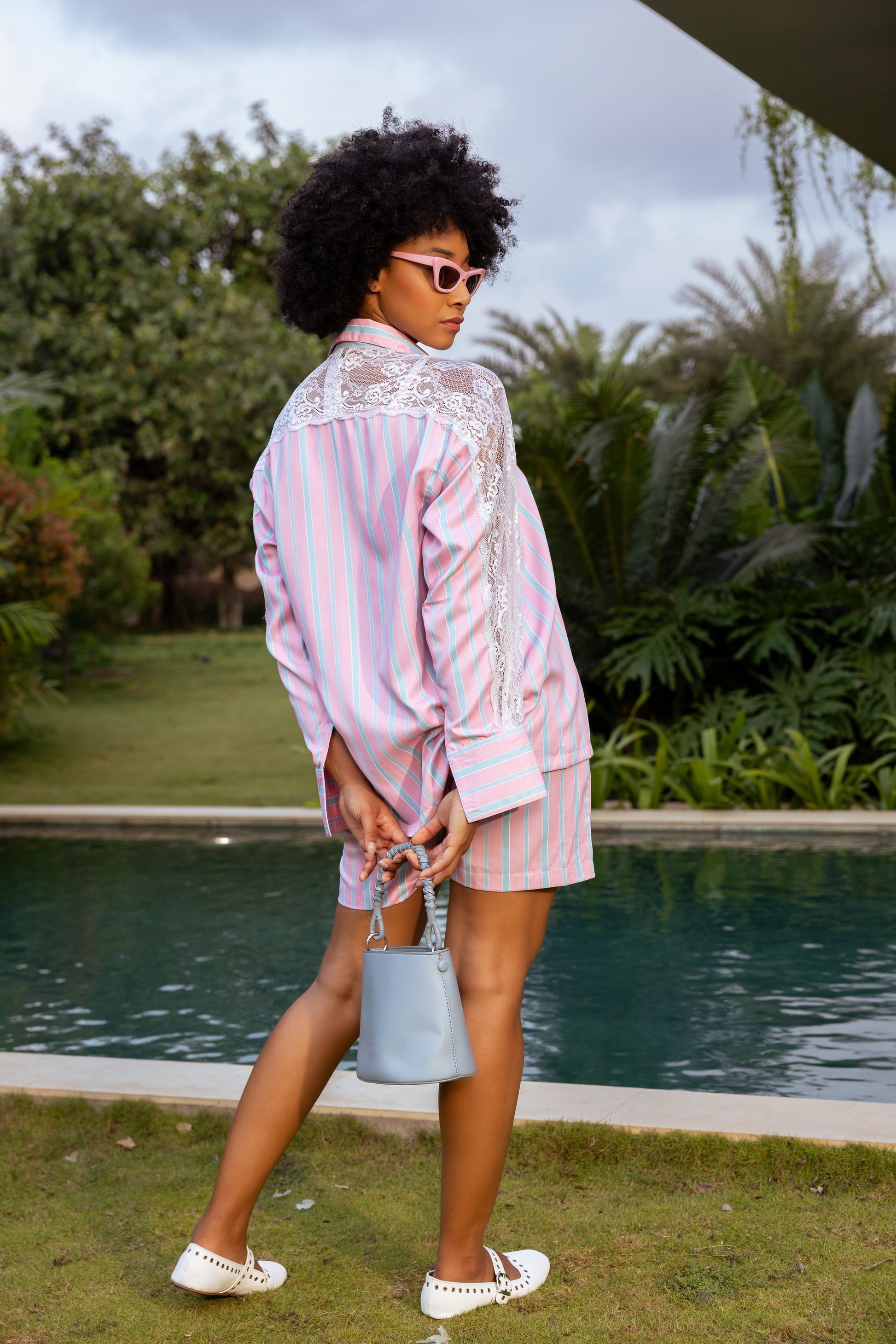 Step into breezy, poolside chic with the Lush Lace-Trimmed Co-ord Set. This 3-piece ensemble features a pastel pink and blue striped shirt with delicate white lace detailing on the sleeves, paired with high-waisted tailored shorts and a matching checkered bralette. This set blends comfort with style — ideal for resort wear, summer getaways, or laid-back brunches.