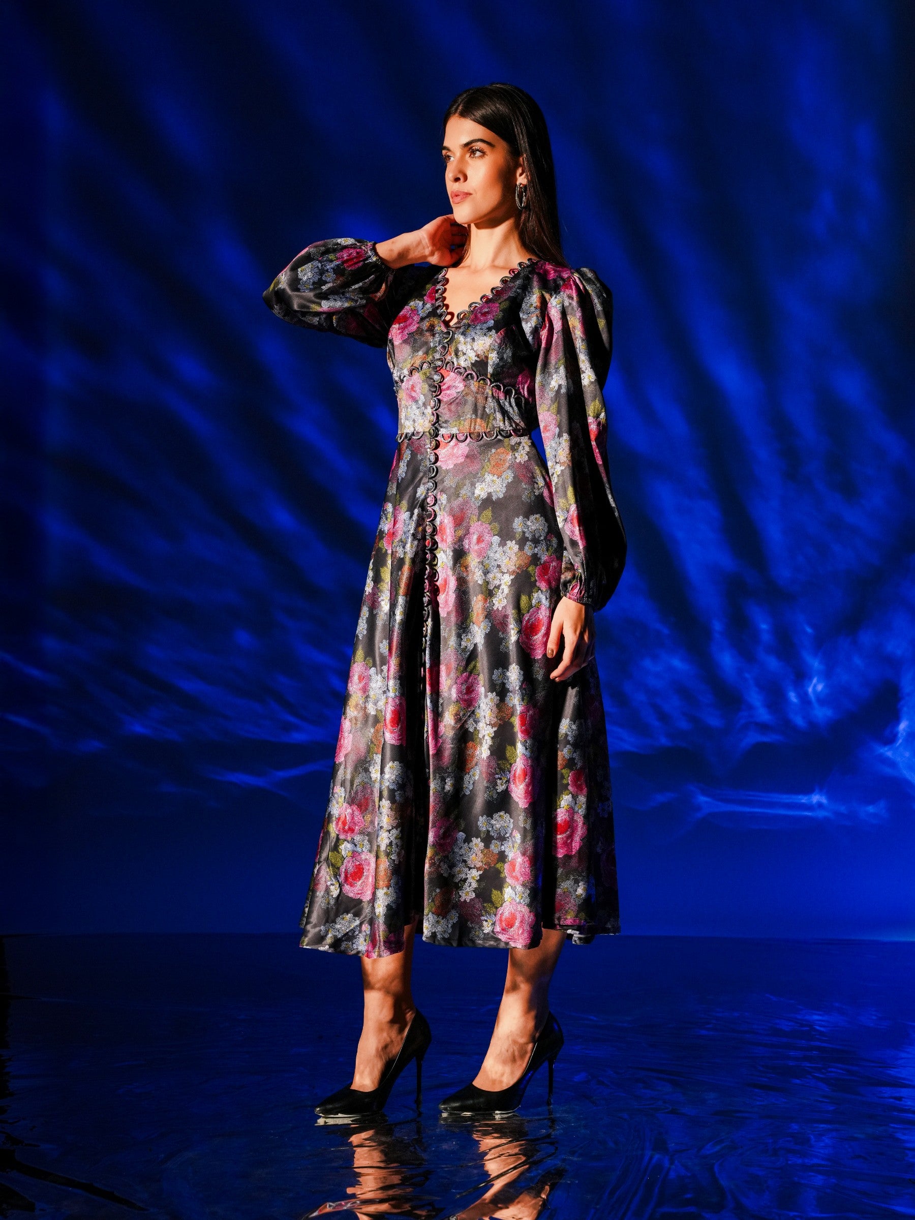The voluminous long sleeves add a touch of structure, while the flared midi skirt creates soft, fluid movement with every step. Its deep-toned floral print offers a rich, sophisticated look that transitions effortlessly from dinners to celebrations. Fully lined for comfort and finished with a concealed back zipper.