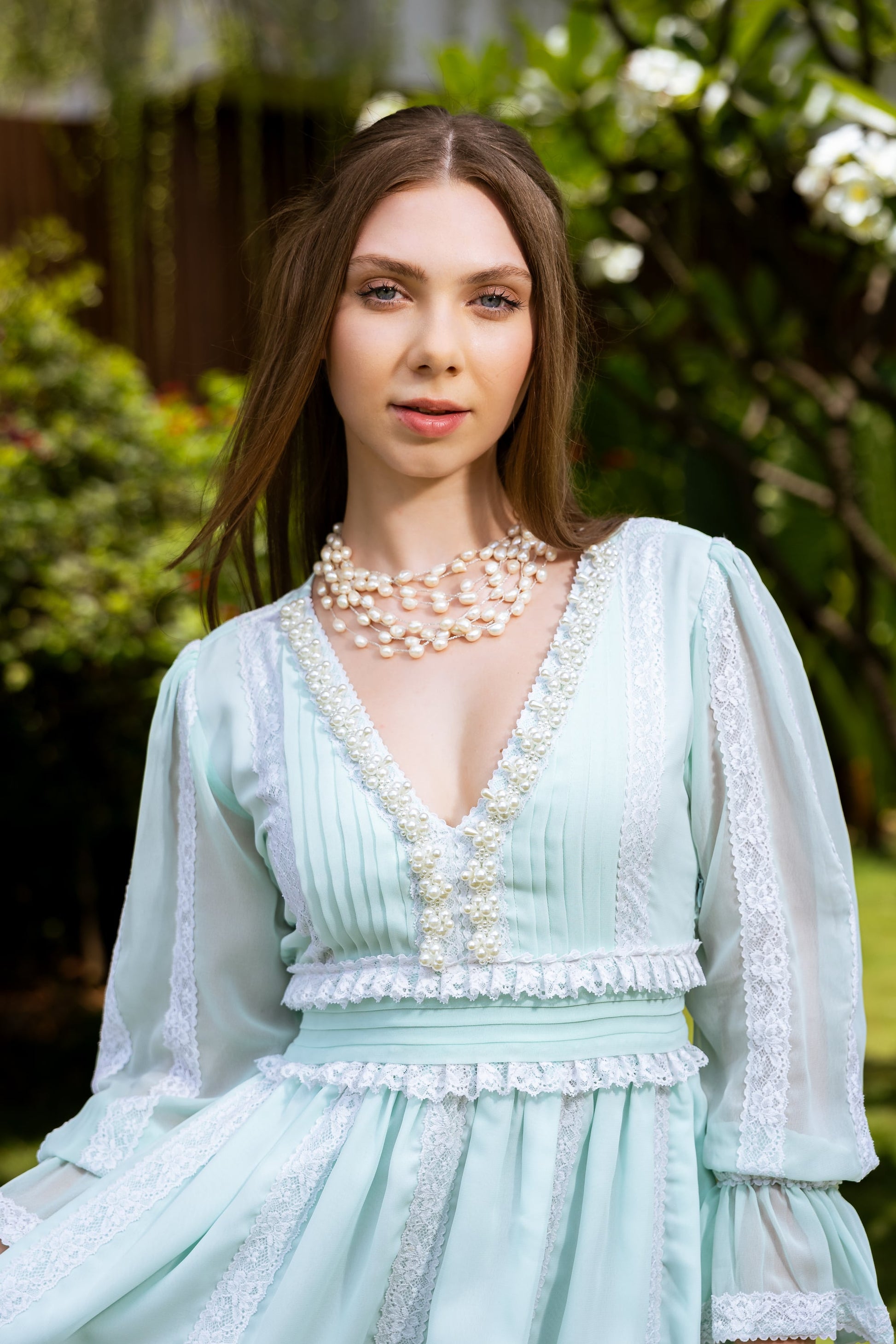 A fresh take on vintage charm, this mint-hued mini dress is crafted in breezy fabric with delicate lace inserts and sheer flared sleeves. The deep V-neckline is detailed with pearl embellishments, offering a subtle yet striking elegance. Finished with a flouncy tiered hem, it’s the perfect pick for summer soirées, day dates, or a graceful twirl in the garden.