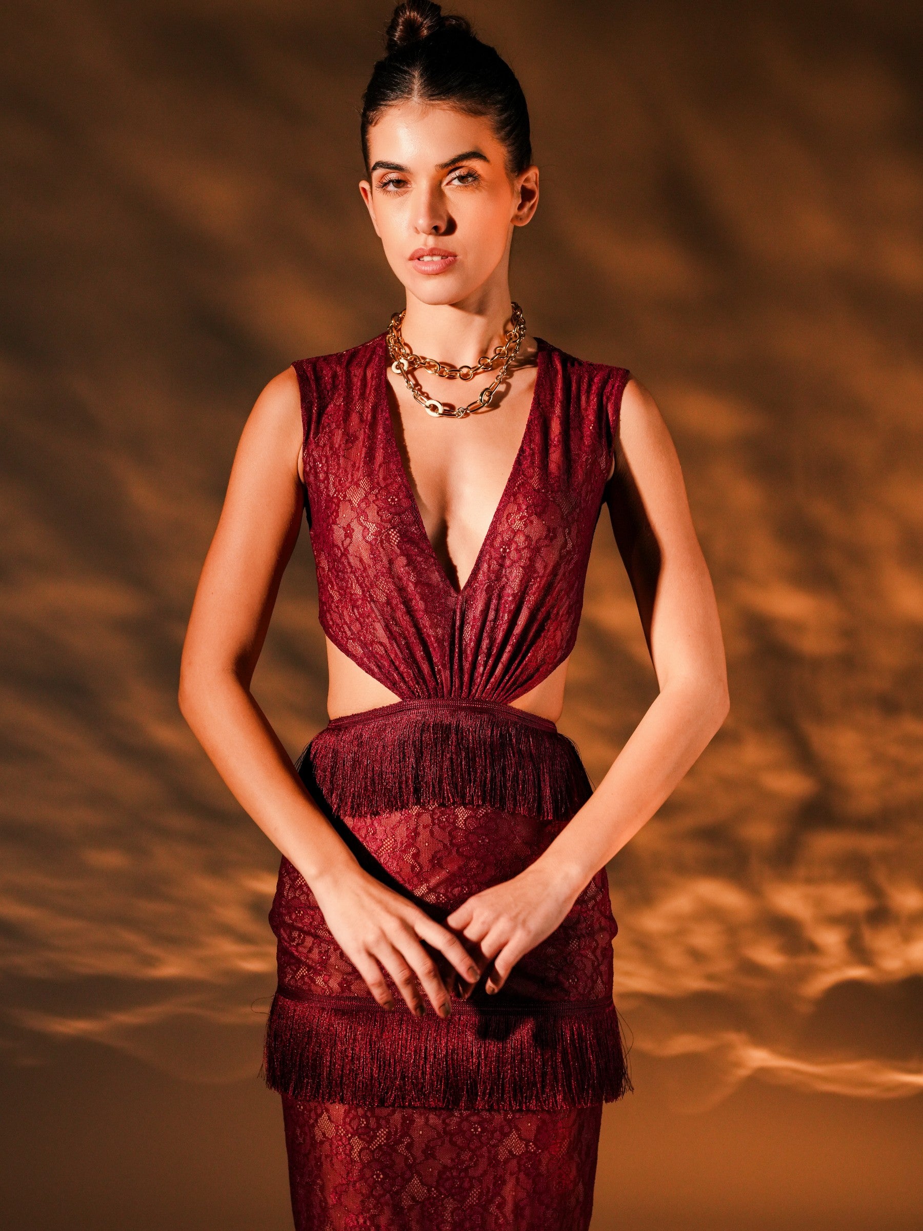 • Designed for evenings that call for bold elegance, the Ruby Fringe Midi Dress blends sensual detailing with refined structure. Crafted from sheer ruby red lace, the dress features a deep V-neck bodice with sculpting side cut-outs that accentuate the waist. The back is finished with a clean zip closure for a secure, polished fit.