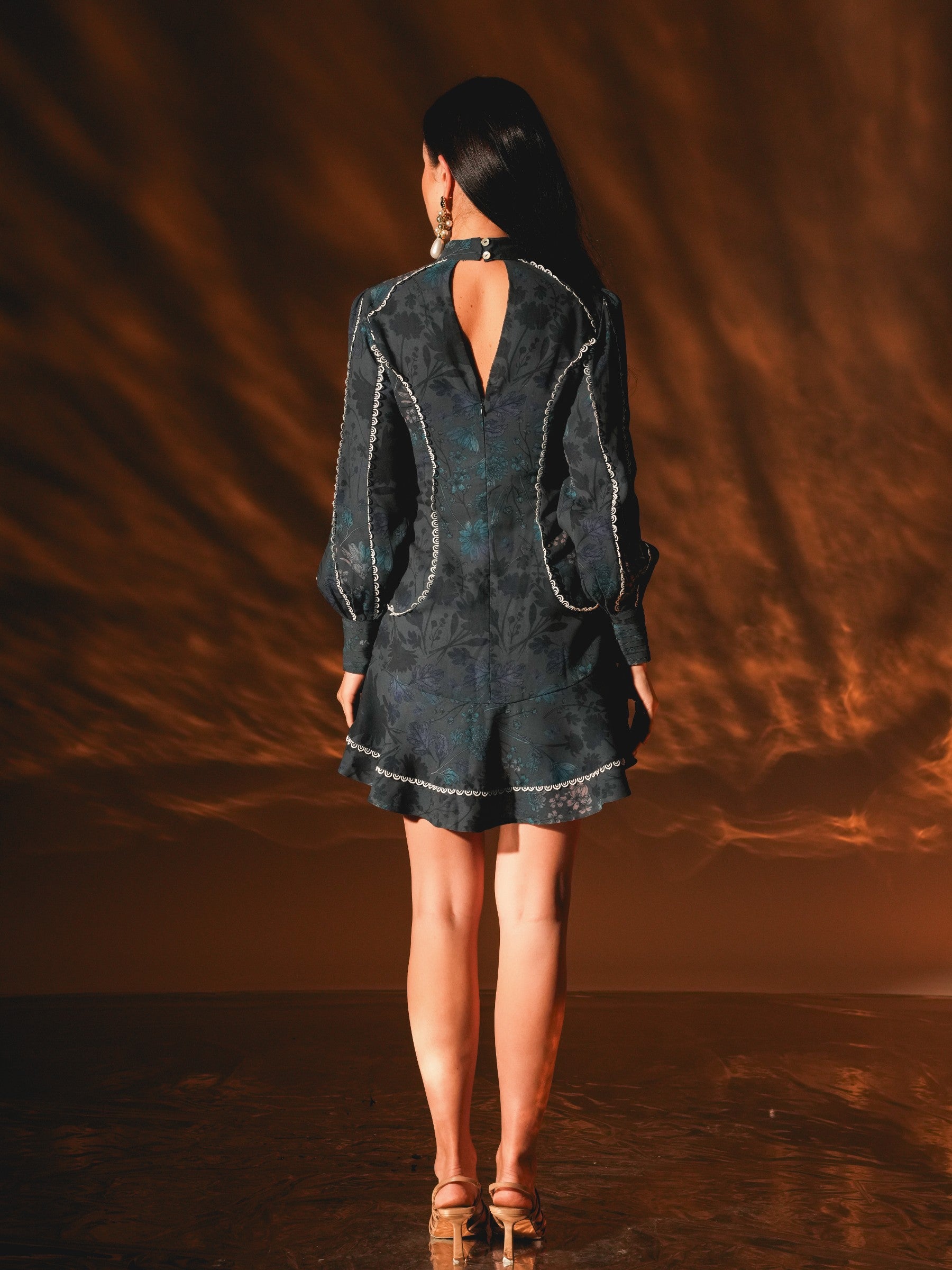 • Designed for evenings that call for quiet drama, the Sea Mist Shadow Dress blends romantic detailing with a sculpted, modern silhouette. Crafted in a deep charcoal base with subtle teal floral accents, the dress features a high neckline with lace-up detailing that adds a hint of allure while keeping the look refined.