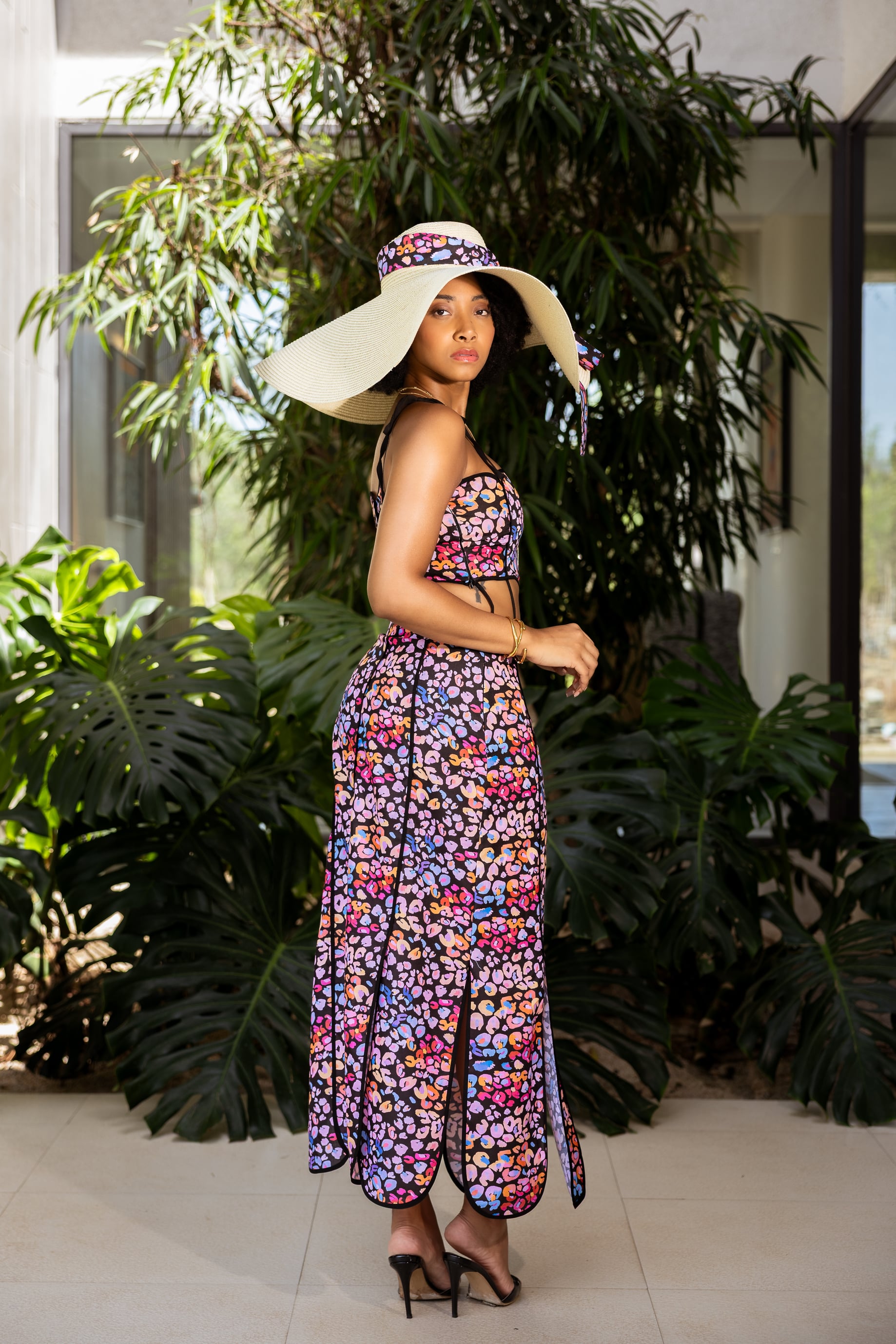 Turn heads under the sun with Solara Dress, a dress that plays with form and color like a mirage in full bloom. Designed to give the illusion of a two-piece set, this connected dress features a structured bodice with bold black contouring, leading into a petal-cut midi skirt that sways with every step. The vibrant floral print — a riot of sunset pinks, violets, and tangerine — captures the spirit of a lush garden seen through a prism of heat and haze.