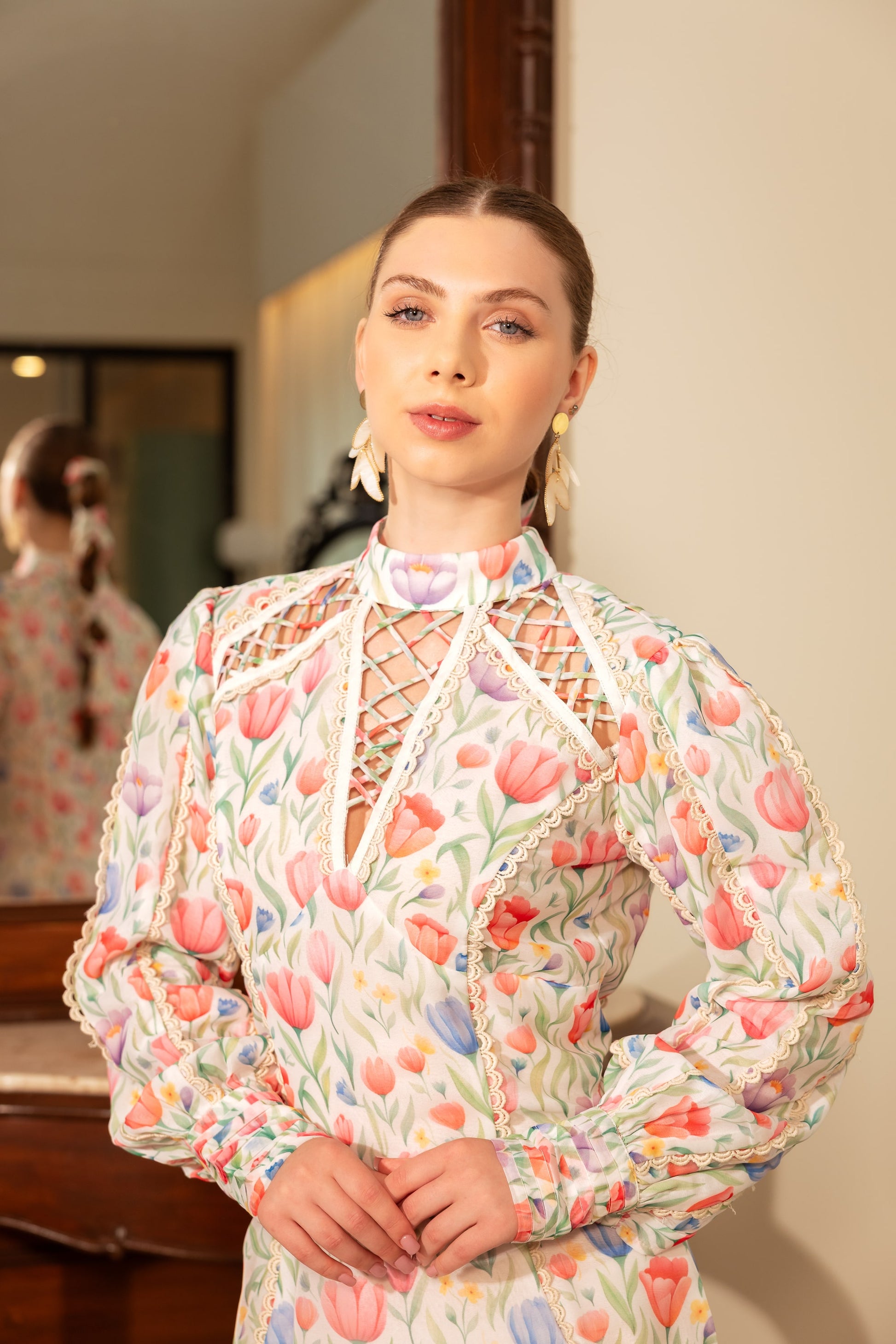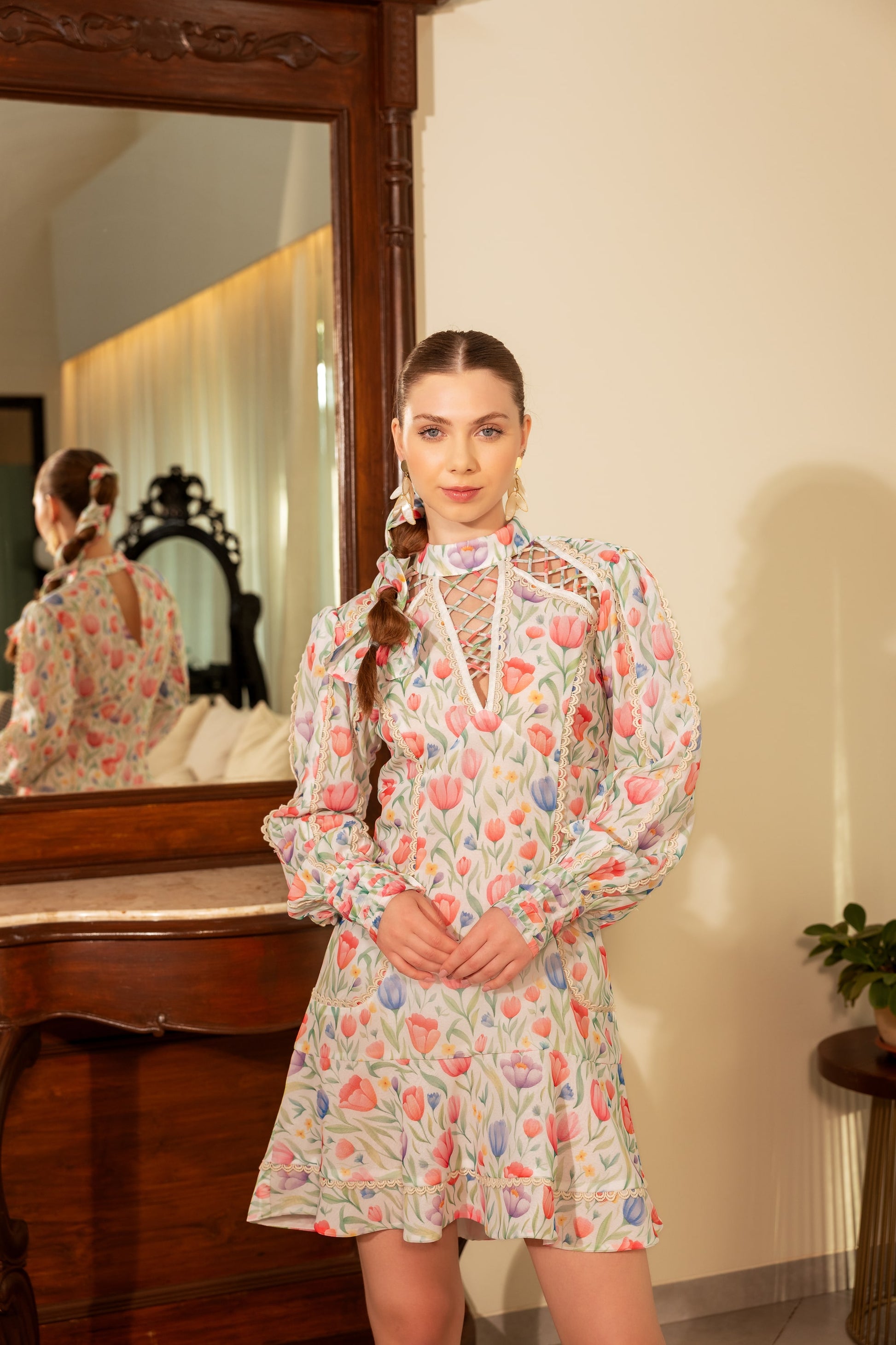 Add a touch of charm and elegance to your wardrobe with the Valentina Mini Dress. Featuring a romantic tulip print in soft pastel tones, this dress is designed with intricate lace-up detailing at the neckline and shoulder for a modern twist. The full-length puff sleeves with ruched cuffs add volume and grace, while the flowy A-line silhouette ensures comfort and movement. Perfect for brunches, garden parties, or casual gatherings.